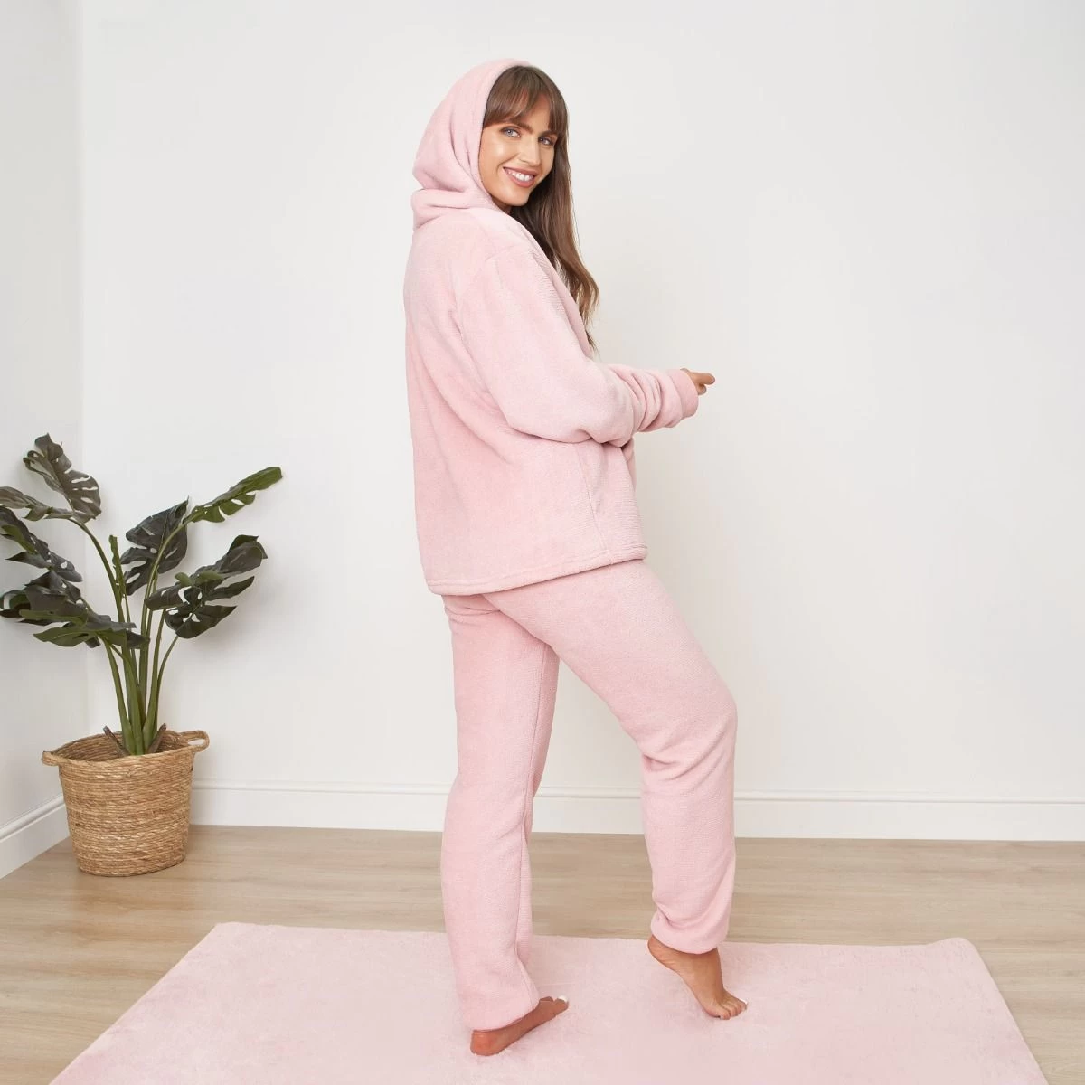 Comfy, stylish and snuggly, our coral fleece pyjama set from the Dreamscene range is soft and cosy, making it perfect for lounging around, for use as nightwear, or even for the ultimate working from home look. This item included a hooded jumper top, and a jogger style bottom, both with soft coral fleece outer layer, and a cosy sherpa fleece lining. The joggers have an elasticated waist and cuffs, while the top has a hood, large front pocket, and finished with elasticated cuffs.