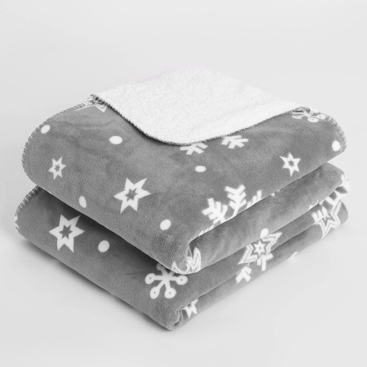 Colour: Grey with white snowflake print, and a reversible white sherpa flannel fleece.