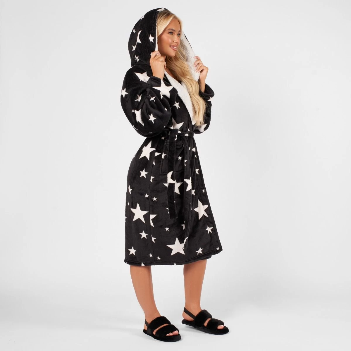 The Star Print Sherpa Fleece Dressing Gown from Dreamscene is perfect to wear around the house. This dressing gown features a sumptuously soft touch fleece on the outer fabric, with a soft sherpa inner lining on the hood and shawl collar, paired with a matching robe tie. Expertly matched with two matching pockets, this will make a fantastic gift for friends and family. Crafted for optimum ease this is a durable, one-step care garment to wear around the house for elevated comfort and style. Simply wash at 30°C. One size fits all with this product and it is ideal for packing up to take to hotels and spas for extra comfort due to its lightweight design.