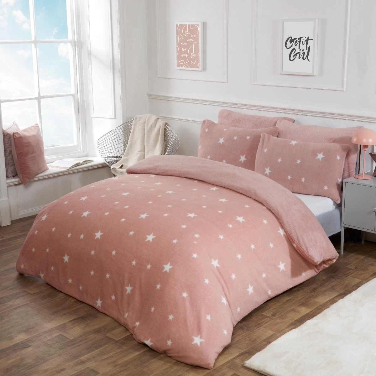 Get ready for those cold wintry nights with our star print teddy fleece duvet set, which will look great in any bedroom, and is a perfect way to give your room a vibrant, warm fresh look. This duvet set is made from super soft touch teddy fleece polyester, with a bold star pattern on the front and plain teddy on the reverse, making it comfortable and durable with added warmth and texture. This ultra soft easy-care bed linen will give your bedroom that modern feel and once washed it has great resistance to wrinkles, fading and shrinkage. This warm fleece teddy set includes a duvet cover and matching pillow case(s), all you need for a good nights sleep. Available in the following sizes:-