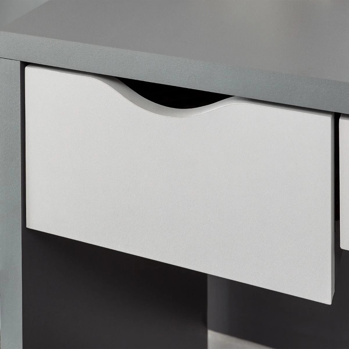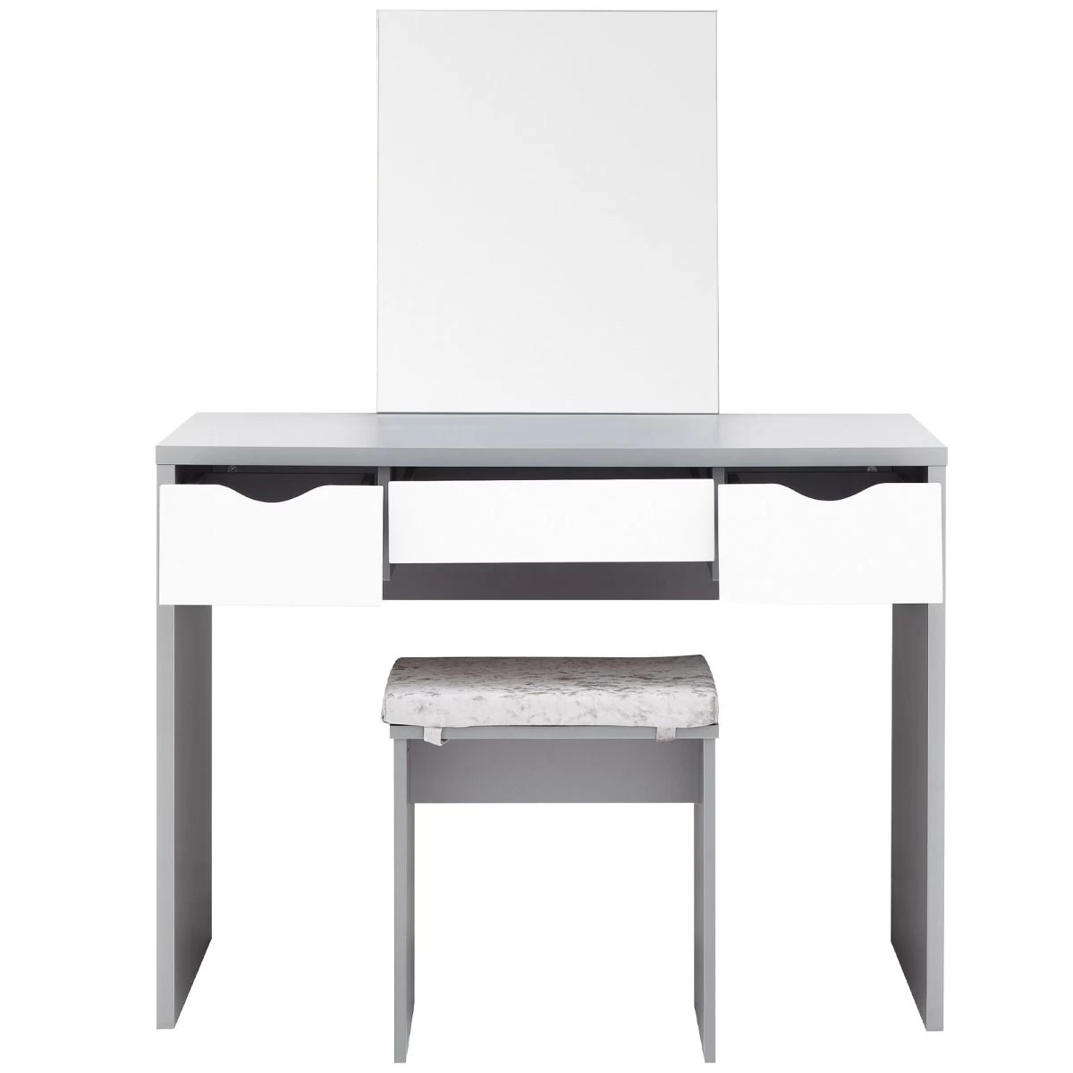 Treat yourself to a dressing table set that’s compact and contemporary in design – ideal for a bedroom where space is at a premium. The simple console-style table has a painted finish, with a trio of drawers in a contrasting shade – each featuring cut-out handles. The table-top has ample space for ornaments and decorative accessories, and there’s a fixed frameless mirror to the back. The matching stool has a removable padded cushion in a plush cover and is designed to slip under the table when not in use.