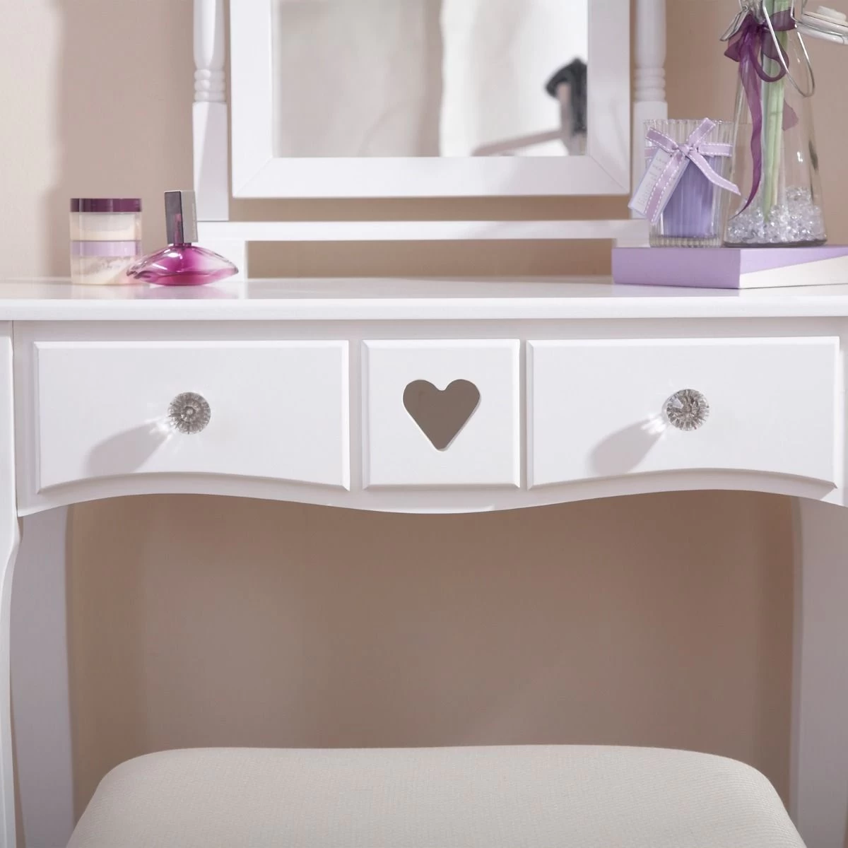 This dressing table features a hand-crafted love heart shape carved into the dressing table and mirror surround. With two drawers, softly curved legs and an adjustable mirror this dressing table set will be an attractive and functional addition to any bedroom.