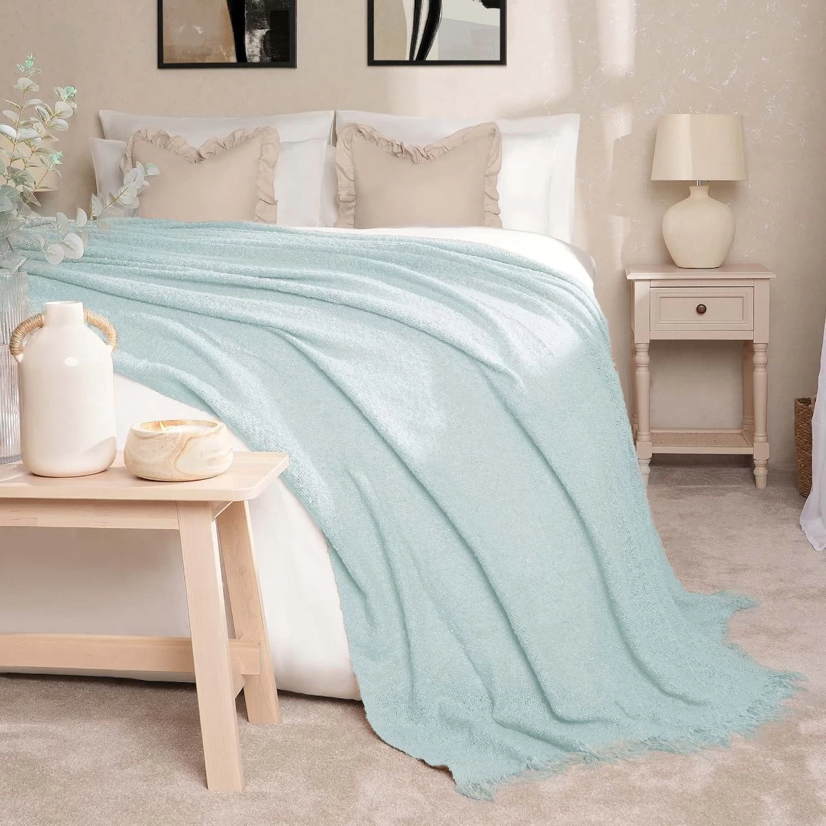 This range of mohair throws from the Highams collection is ideal for use as a throw over furniture such as couches, beds and sofa beds. The soft acrylic material makes this the perfect blanket to snuggle up to, and subtle colours add a vibrant colour and decorative feel to any room. The thin tassle on each end of the trow add a stylish effect. It’s multi purpose use allows for travelling, glamping or camping as it can be easily rolled up and stored in a bag or in the car.