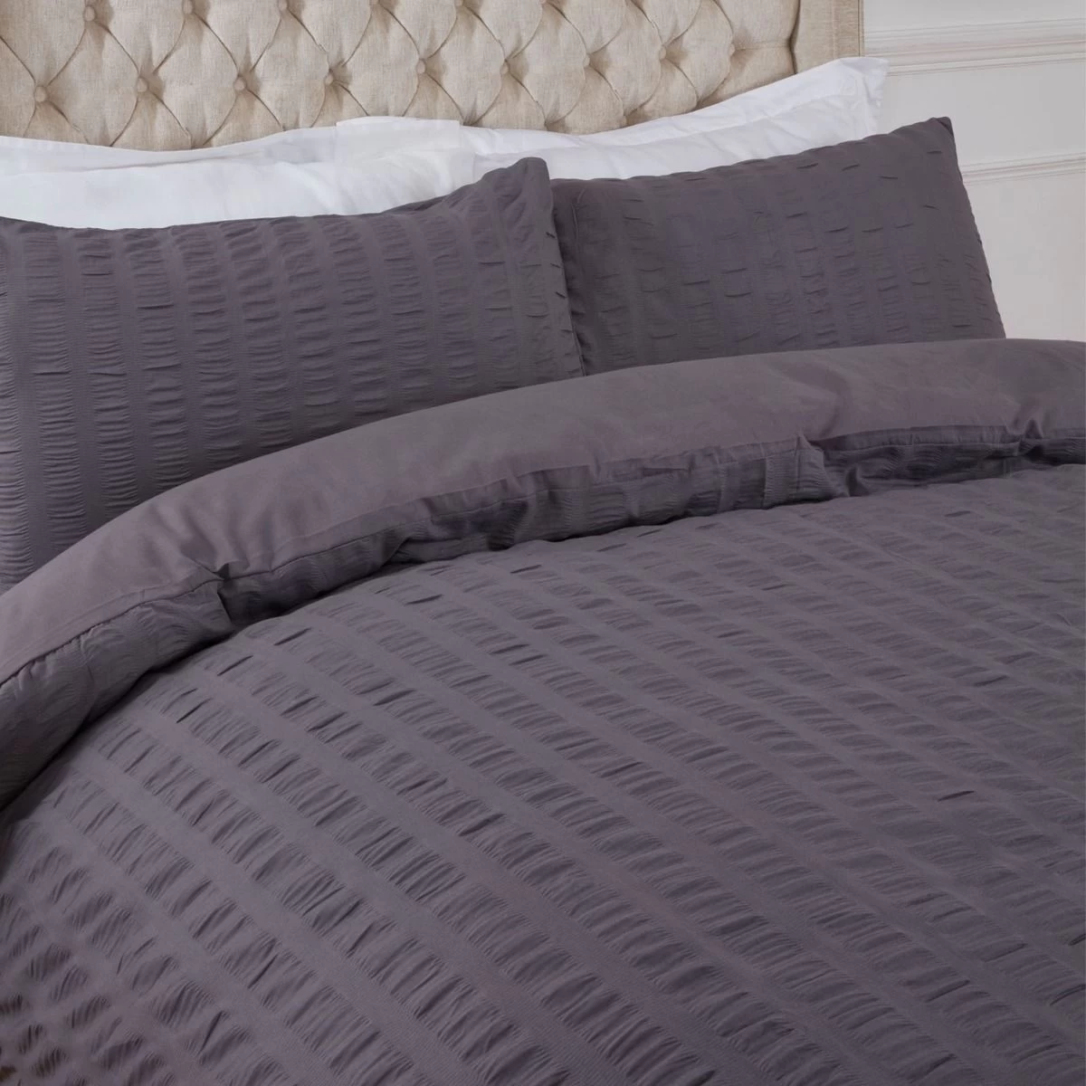 This contemporary duvet cover set from Highams is a bed linen design which will add a clean modern finish to any bedroom. With its ruffled seersucker design on the front, and the plain polycotton on the reverse, this set comes with matching pillow case(s). This Hotel quality bedding set is made from a breathable, soft, comfortable and durable material, which will ensure a relaxing nights sleep, whilst retaining easy care qualities. Available in the following sizes:-