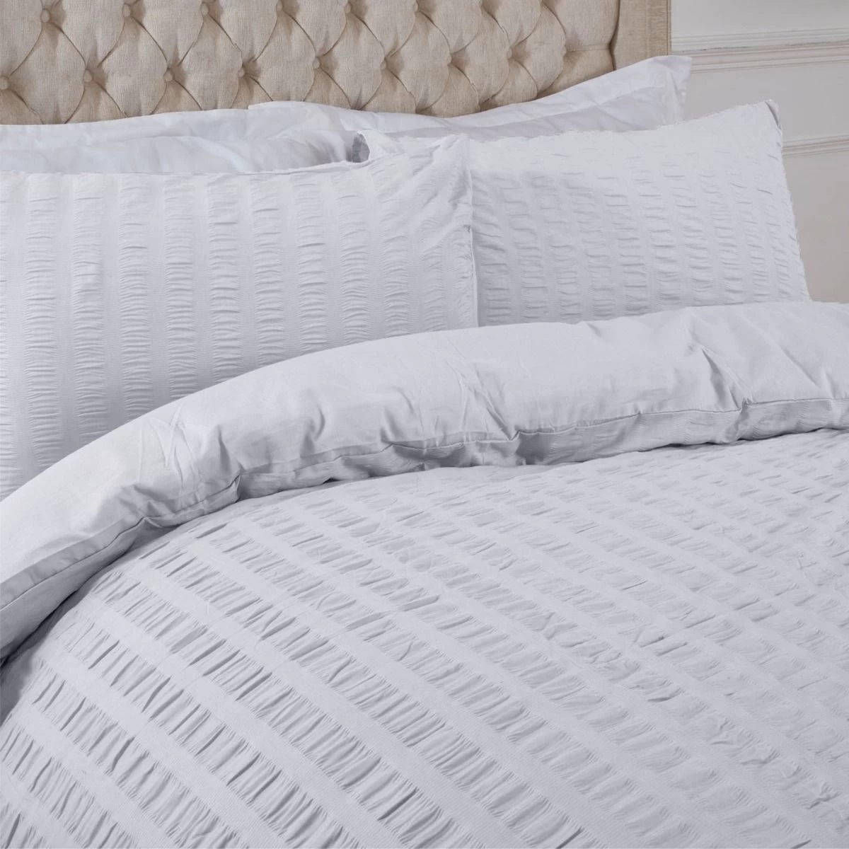 This contemporary duvet cover set from Highams is a bed linen design which will add a clean modern finish to any bedroom. With its ruffled seersucker design on the front, and the plain polycotton on the reverse, this set comes with matching pillow case(s). This Hotel quality bedding set is made from a breathable, soft, comfortable and durable material, which will ensure a relaxing nights sleep, whilst retaining easy care qualities. Available in the following sizes:-