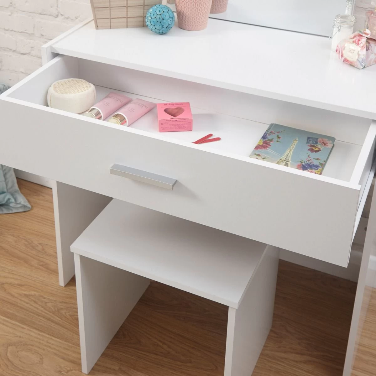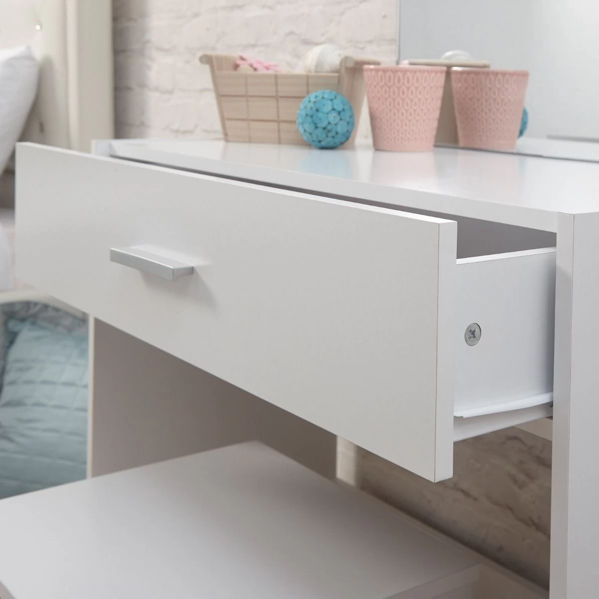Create a dedicated vanity space in your bedroom with this attractive dressing table, mirror and stool from the Julia collection. The handy drawer will house all your jewellery and cosmetics whilst the three gorgeous finishes available offer stylish appeal for your home. Finished off with a sleek rectangular metal handle.