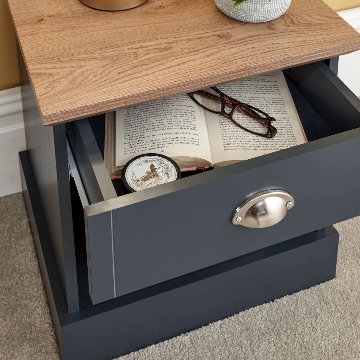 Thick Oak-effect top with feature design bevel creates a stunning high-quality look and feel.