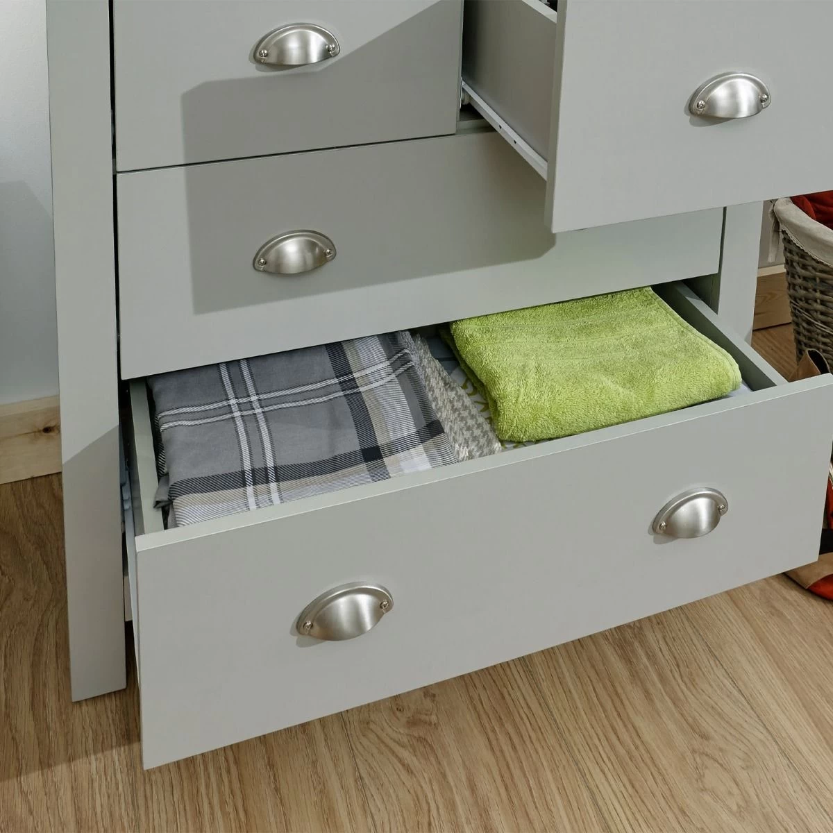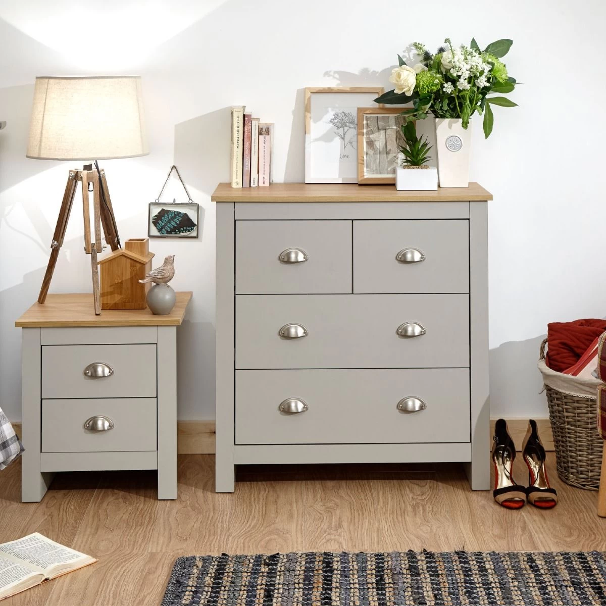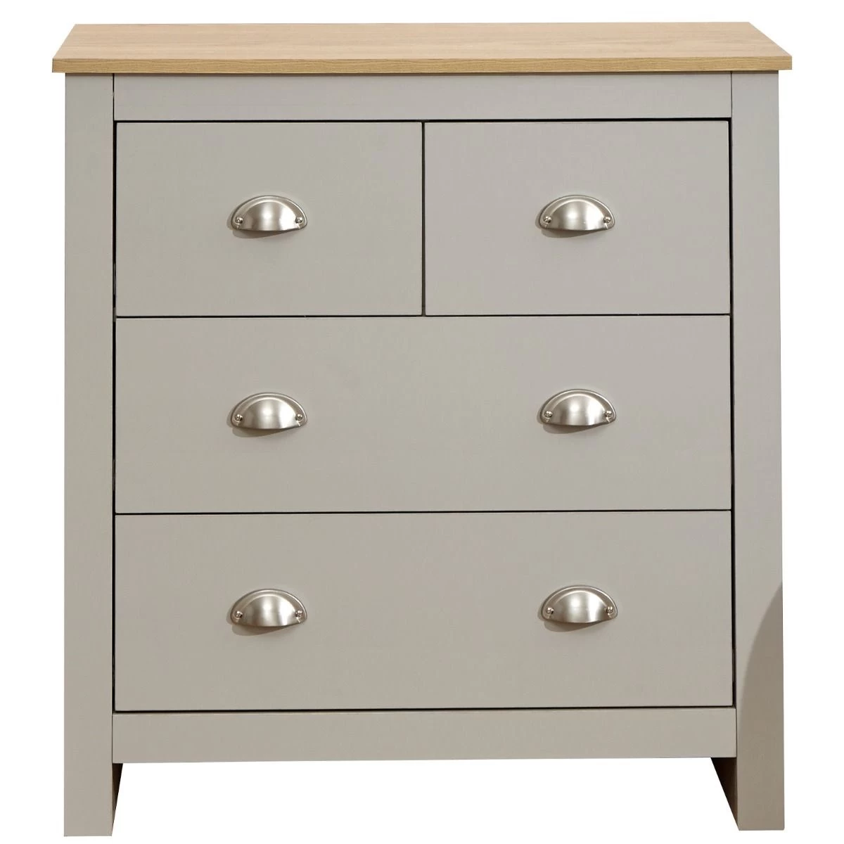 A stylish shaker-inspired chest of drawers that’s perfect for kitting out a bedroom in first-class style. The sleek lines, soft grey or cream foiled finish with oak tops and brushed steel handles create a sophisticated impression. The chest of drawers provides effective storage with 2 small drawers and 2 large drawers. Ideal for a room where understated elegance is the goal.