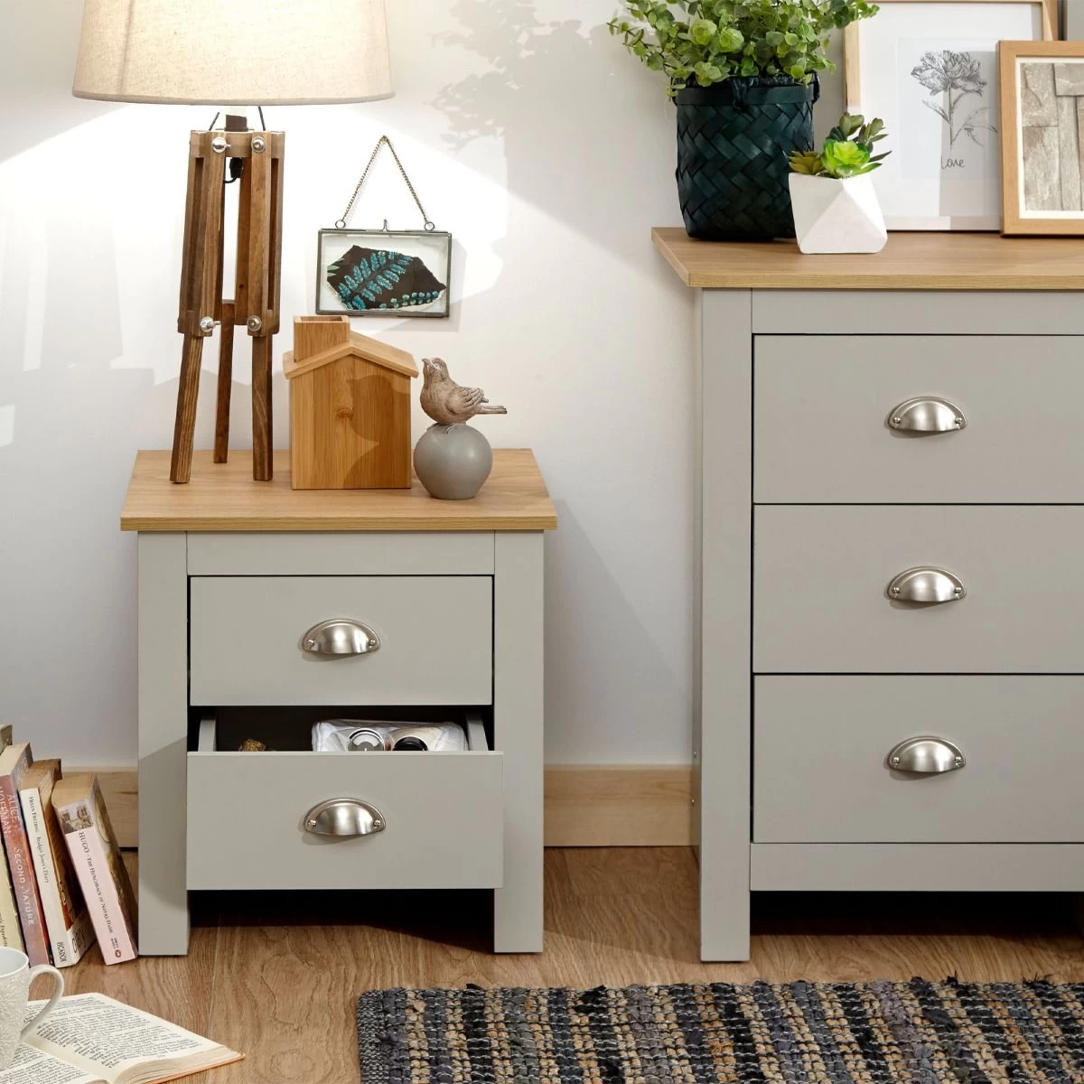A stylish shaker-inspired bedside table that’s perfect for kitting out a bedroom in first-class style. The sleek lines, soft grey or cream foiled finish with oak tops and brushed steel handles create a sophisticated impression. The bedside table provides effective storage with 2 drawers. Ideal for a room where understated elegance is the goal.