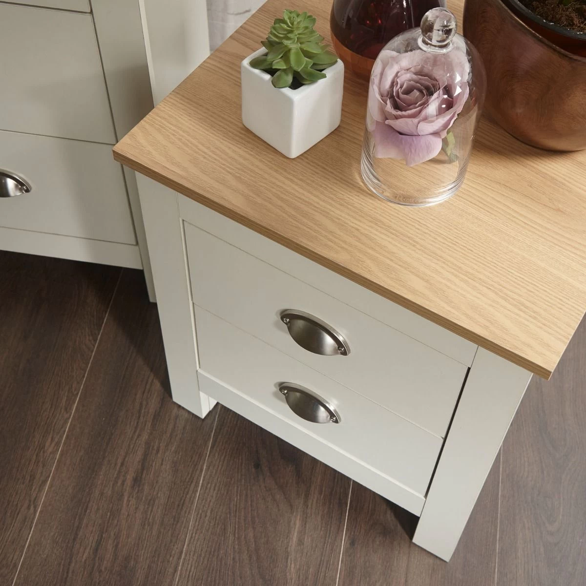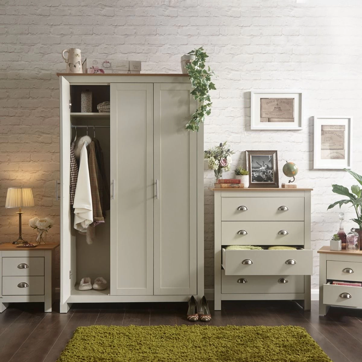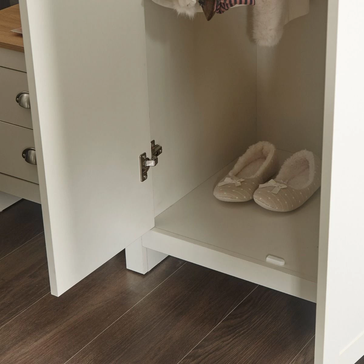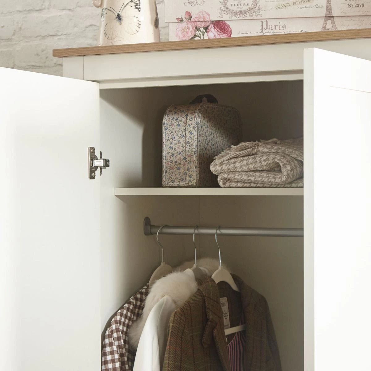 It’s easy to create a bedroom that showcases effortless chic, with this stylish four-piece furnishing pack. The shaker-inspired design exudes understated luxury. Comprising a three-door wardrobe, four-drawer chest and pair of neat lamp tables, each piece is finished in cream or grey foil with an oak top and brushed steel handles. A well-thought-out mix of hanging and flat storage that’s suitable for a double room.