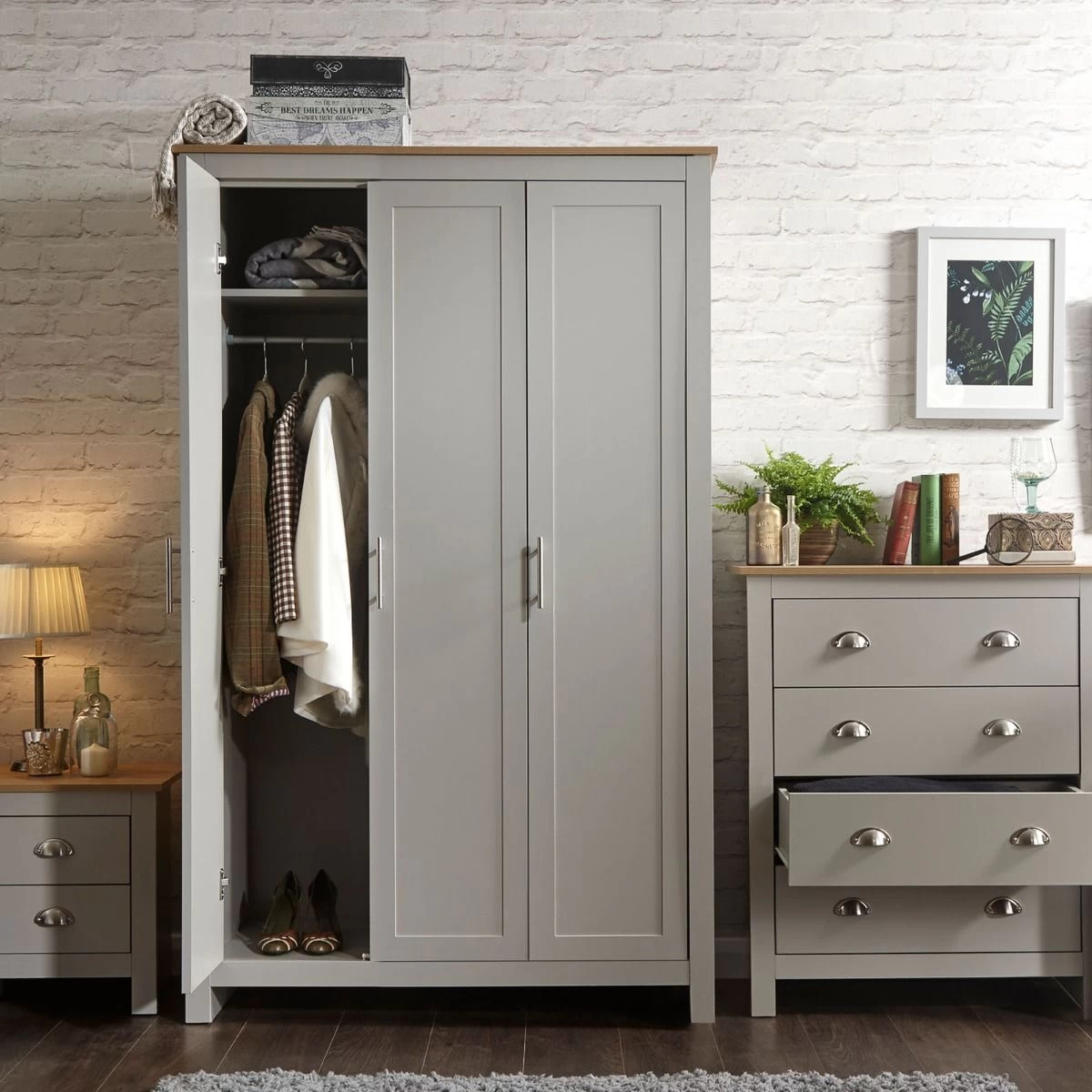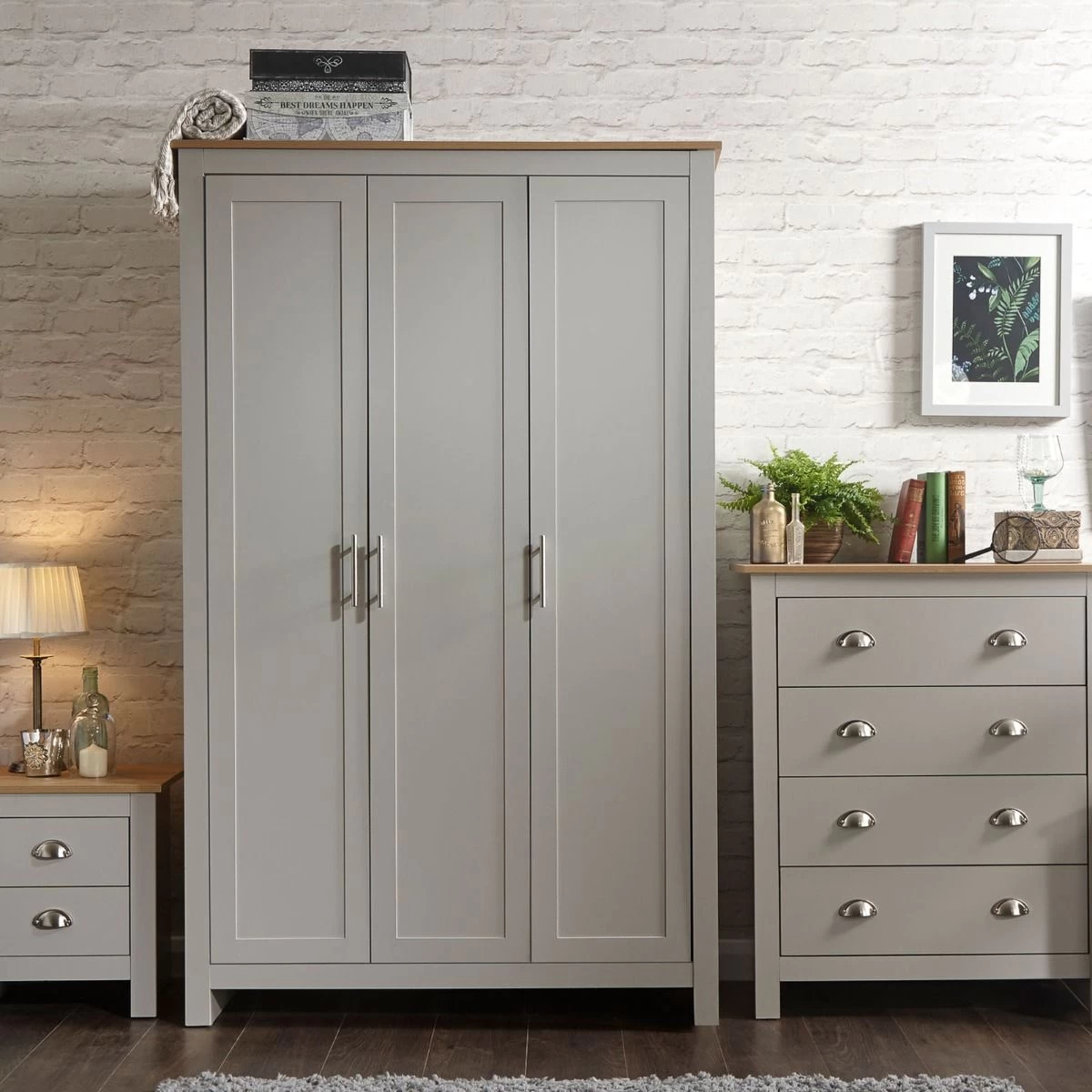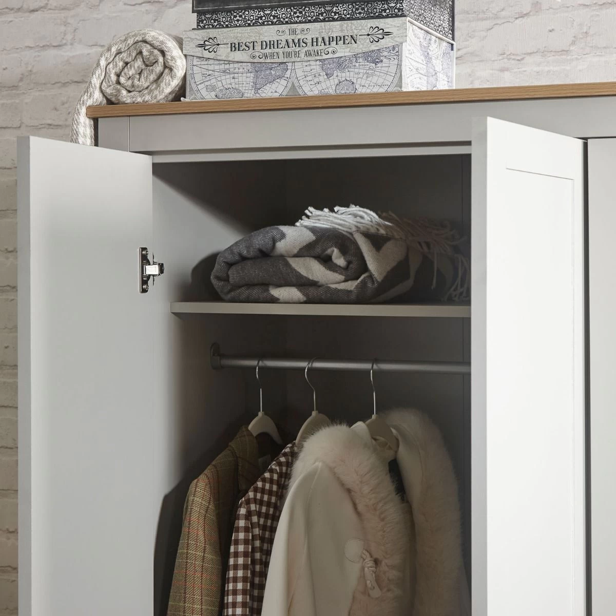 It’s easy to create a bedroom that showcases effortless chic, with this stylish four-piece furnishing pack. The shaker-inspired design exudes understated luxury. Comprising a three-door wardrobe, four-drawer chest and pair of neat lamp tables, each piece is finished in cream or grey foil with an oak top and brushed steel handles. A well-thought-out mix of hanging and flat storage that’s suitable for a double room.