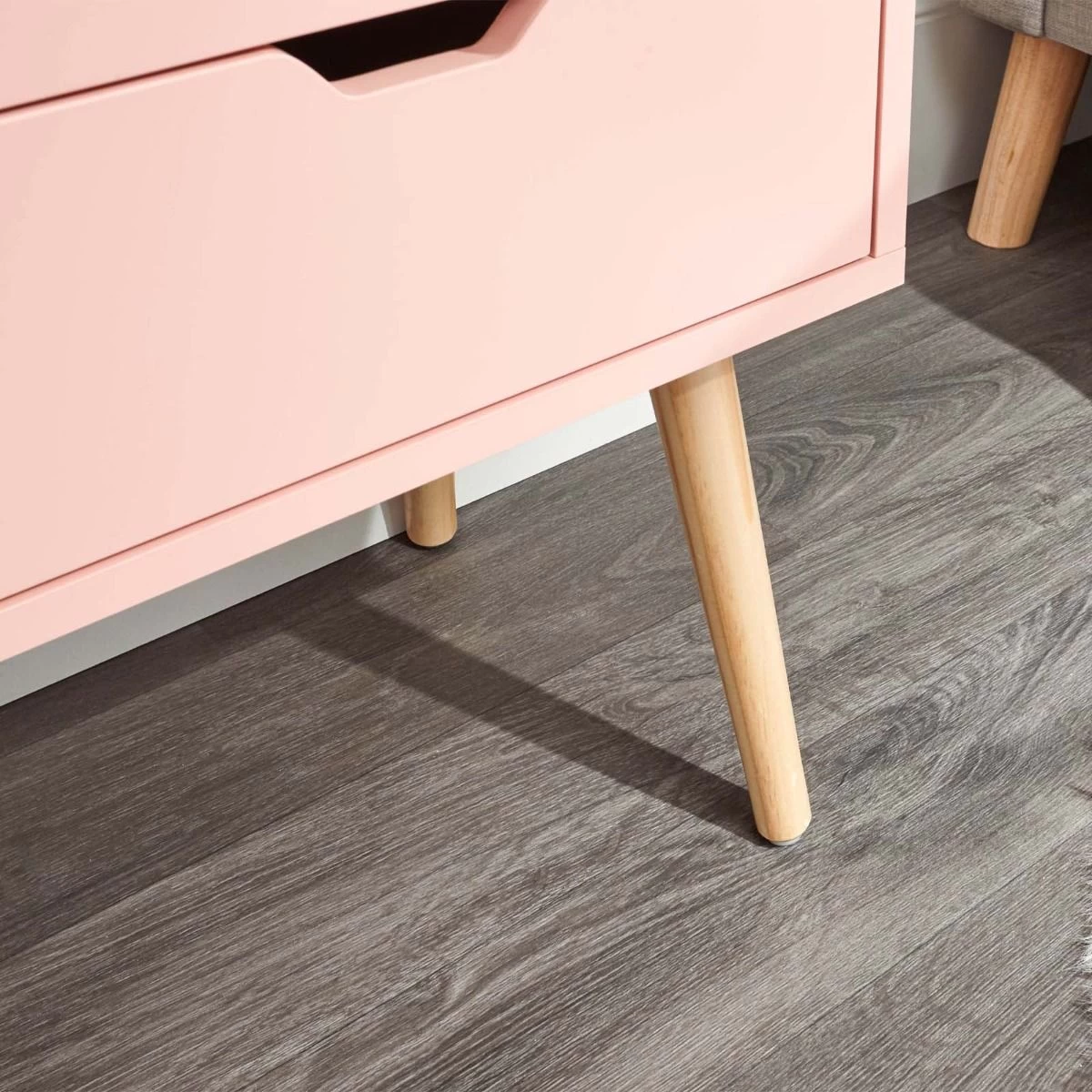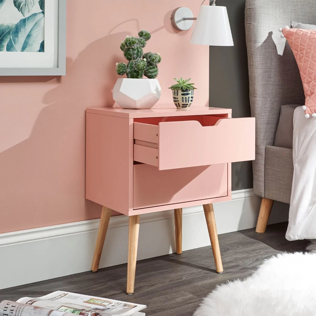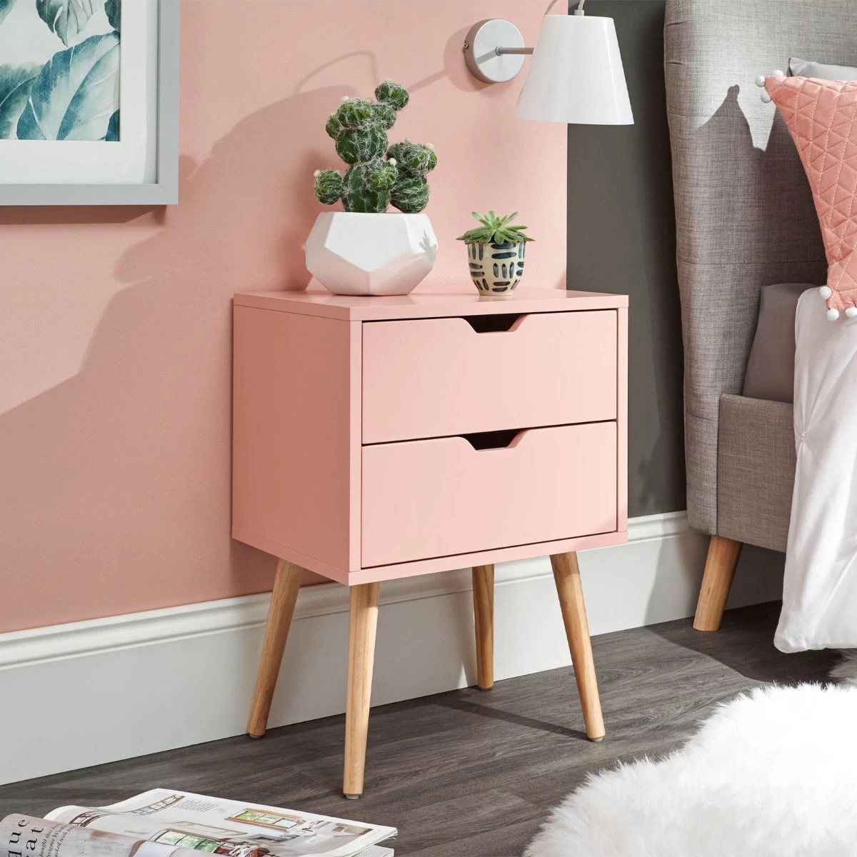 This Scandi-inspired unit makes a virtue out of simplicity. The classic cuboid form is just the right size to accommodate a lamp and a book or two, while the two handy drawers feature classic cut-out handles for simple yet effective operation. The whole is painted in a choice of on-trend colours – including exciting new shades of warm pink, soft green and ink blue – and mounted on pale-wood legs.