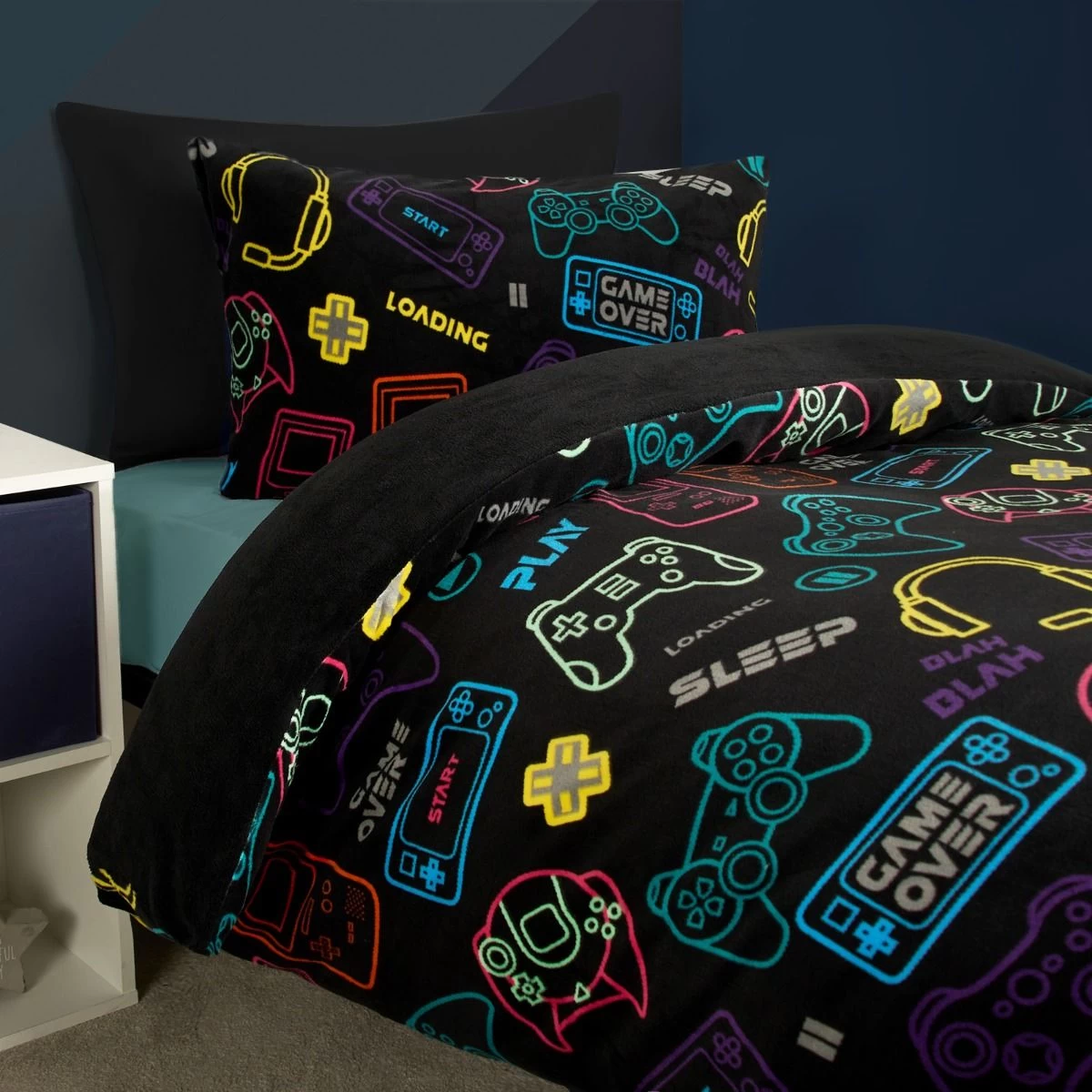 Introducing the OHS Gaming Print Fleece Duvet Set in Black – a must-have for all gamers! This bold and striking bedding set showcases iconic gaming symbols like headsets and controllers in vivid neon hues, all set against a sleek black backdrop. Crafted from plush coral fleece, this duvet set offers extra comfort and warmth, making it the perfect addition to your gaming den or bedroom. Dive into the world of gaming while enjoying the ultimate adventure in coziness and style.