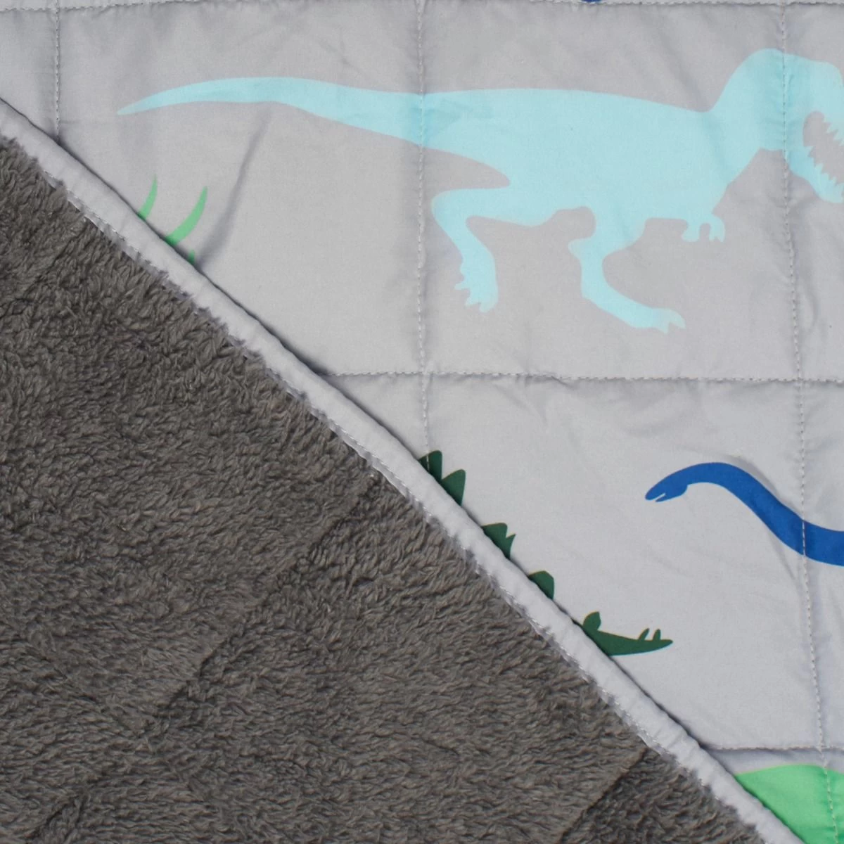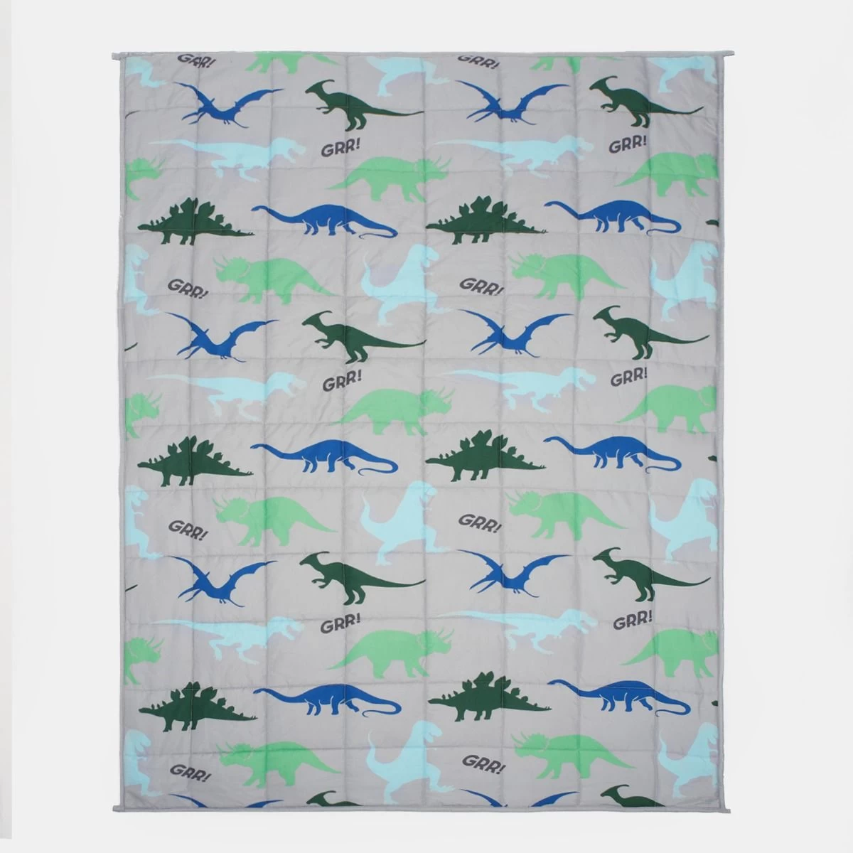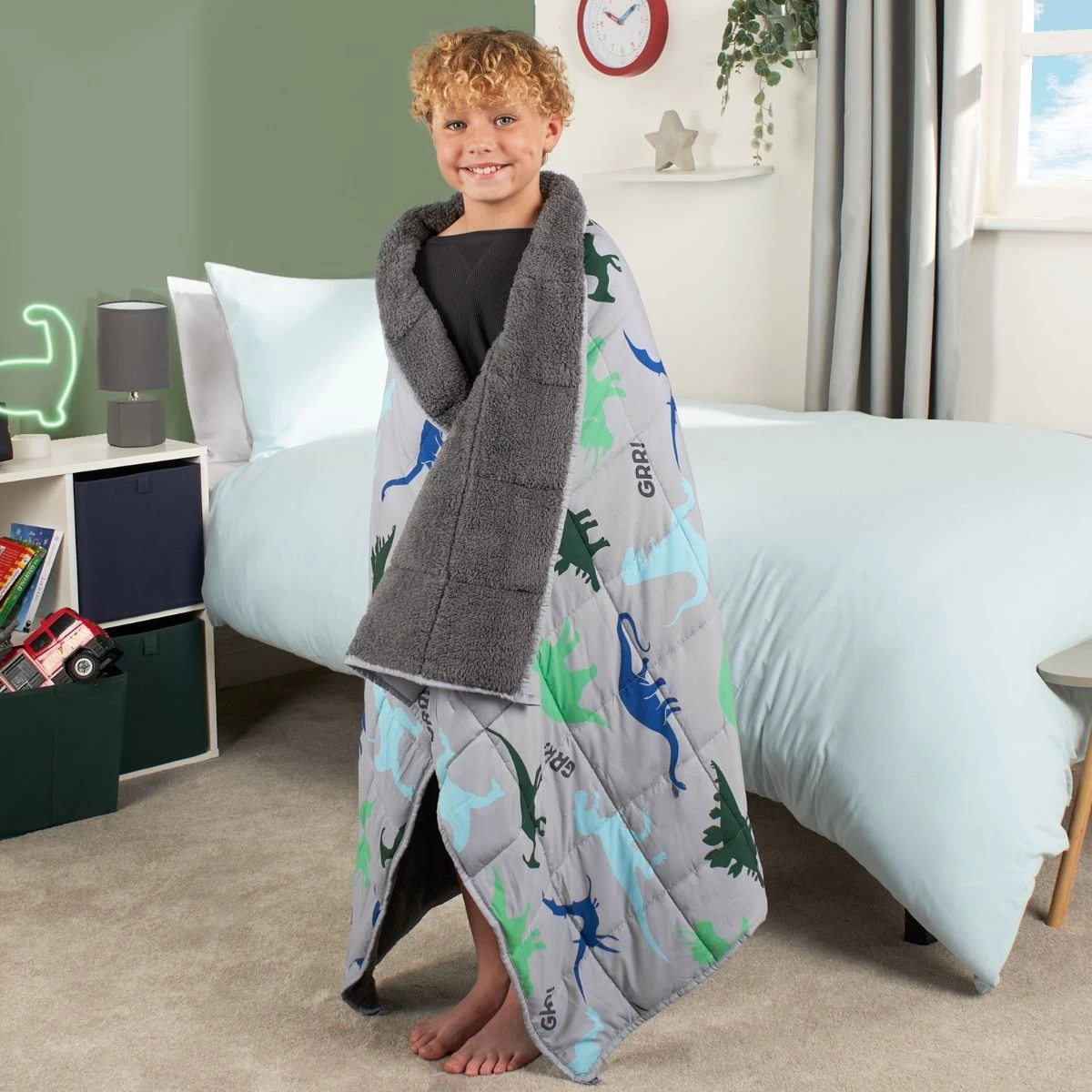 This dinosaur printed super soft teddy weighted blanket from our OHS Junior range, and has been expertly crafted to help relieve stress, insomnia, anxiety and ADHD. This size and weight has been created for children specifically so they can enjoy bed time every night, and the weight simulates a hug and stimulate a longer more deeper sleep. Using the revolutionary ‘Deep Touch Pressure Stimulation’ therapy – known for releasing a sense of serenity and calm – the compact stitched pockets distribute weight evenly across the entire body, creating a calming, snuggle effect. Certified, non-toxic, hypo-allergenic micro glass beads contained within the 5 inch pockets and microfibre cover, ensures this blanket is healthy, breathable, durable, and overall comforting, whilst also stimulating the stress points. This OHS sensory weighted blanket contains several loops allowing you to attach a cover, for easy care.