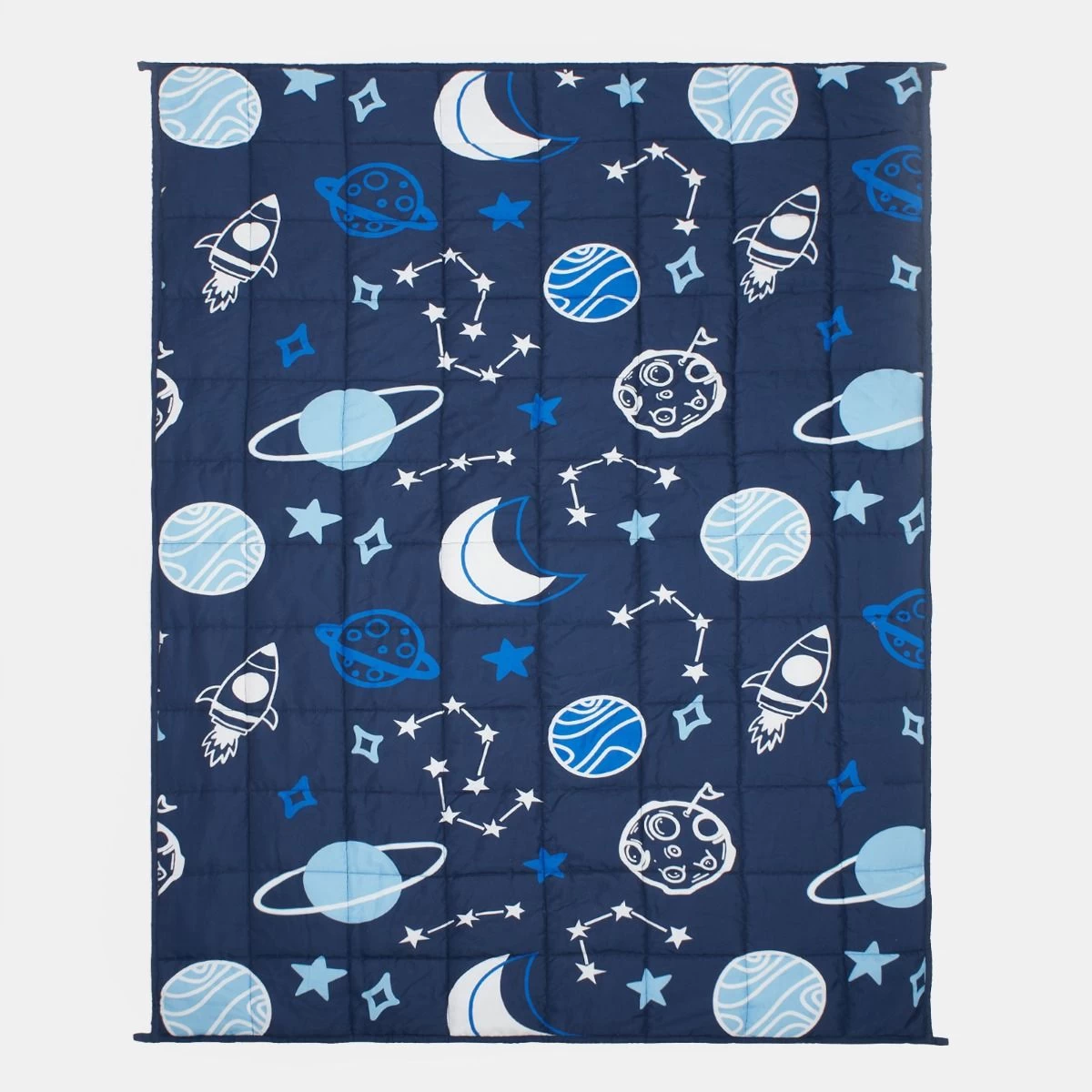 This space printed super soft teddy weighted blanket from our OHS Junior range, and has been expertly crafted to help relieve stress, insomnia, anxiety and ADHD. This size and weight has been created for children specifically so they can enjoy bed time every night, and the weight simulates a hug and stimulate a longer more deeper sleep. Using the revolutionary ‘Deep Touch Pressure Stimulation’ therapy – known for releasing a sense of serenity and calm – the compact stitched pockets distribute weight evenly across the entire body, creating a calming, snuggle effect. Certified, non-toxic, hypo-allergenic micro glass beads contained within the 5 inch pockets and microfibre cover, ensures this blanket is healthy, breathable, durable, and overall comforting, whilst also stimulating the stress points. This OHS sensory weighted blanket contains several loops allowing you to attach a cover, for easy care.