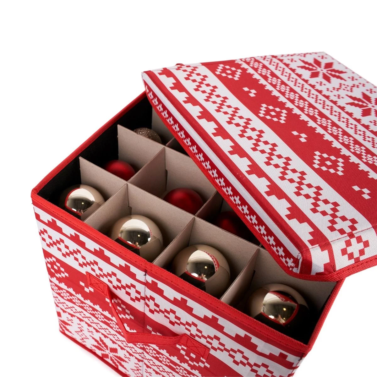 The OHS Nordic Print Christmas Bauble Storage Box in Red provides organized and protective storage for your Christmas baubles. Complete with an instructions manual and cardboard dividers, this box ensures safekeeping and easy organization of your cherished decorations. Keep your Christmas ornaments secure and conveniently stored until the next festive season.