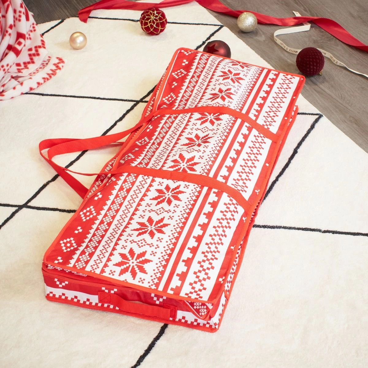 The OHS Nordic Print Christmas Wrap Storage Bag in Red offers a stylish and practical solution for storing your Christmas wrapping supplies. Featuring pockets and compartments, this storage bag helps you keep your gift wraps, ribbons, and accessories neatly organized and easily accessible. Simplify your holiday preparations and keep your wrapping essentials in one convenient place.