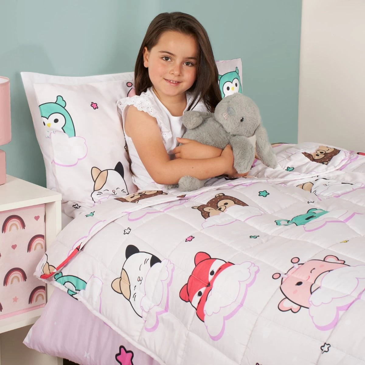 Introducing the Squishmallows Dreams Weighted Blanket – the perfect cuddly companion for a night of sweet dreams! This isn’t just any ordinary blanket; it’s designed to cocoon your child in a soothing embrace that’s as comforting as their favourite Squishmallow. Whether they’re embarking on imaginative adventures or simply relaxing, this weighted blanket creates a snuggly sanctuary that promotes relaxation and peaceful sleep. Ideal for winding down after a day of playtime, hugging Squishmallows, or diving into a good book, it’s a must-have for every Squishmallows fan. With its soft texture and whimsical charm, bedtime has never been this cosy and delightful. Elevate sleep into a realm of comfort and imagination with this fantastic weighted blanket!