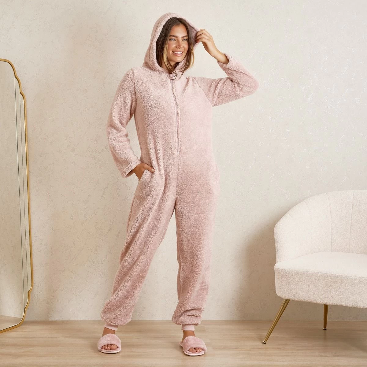 Get ready to relax in our teddy fleece onesie jumpsuit which is soft and cosy, this item features long sleeves with a hood, pockets and a zip closure. This item is perfect for lounging around, or to use as nightwear, or even for the ultimate work from home look.