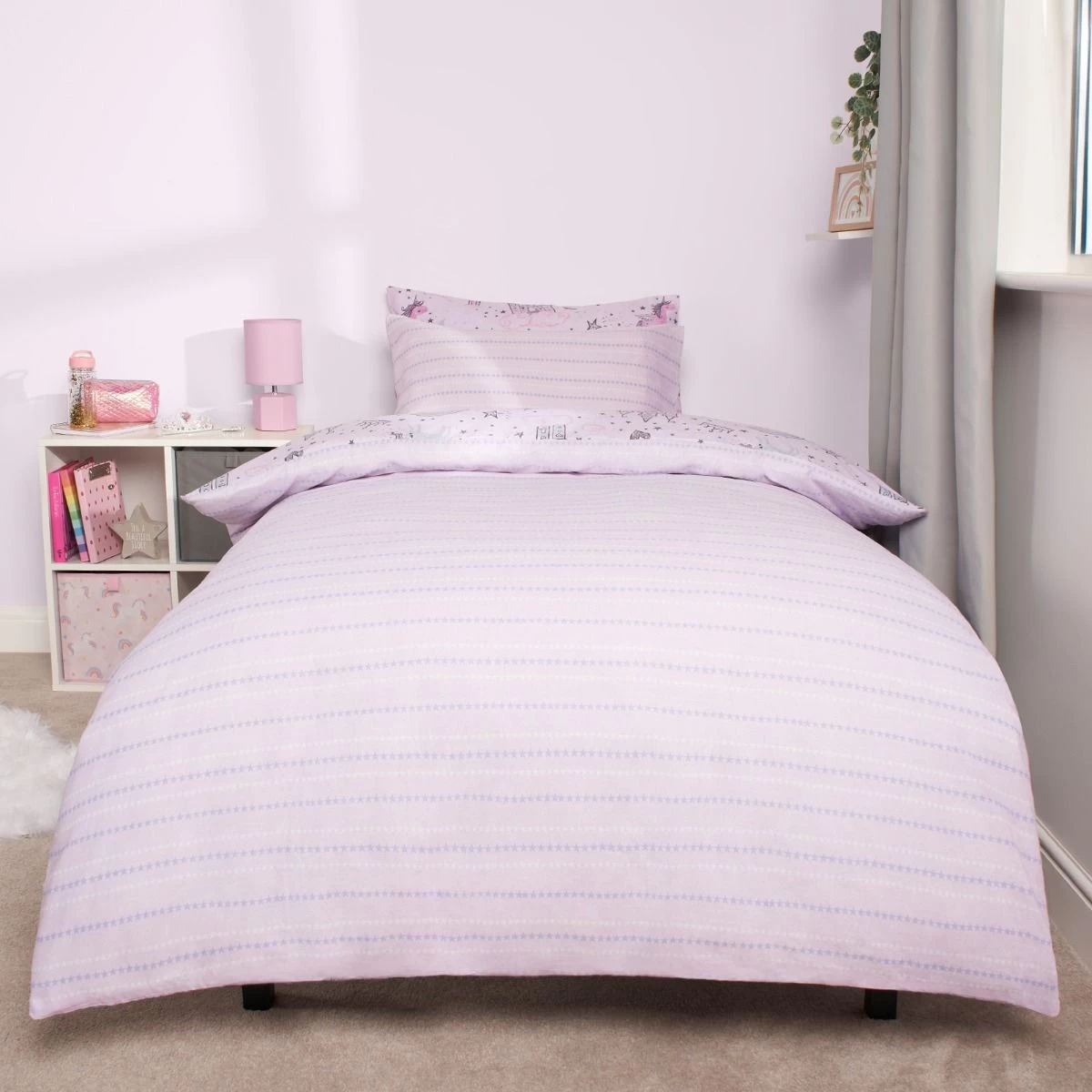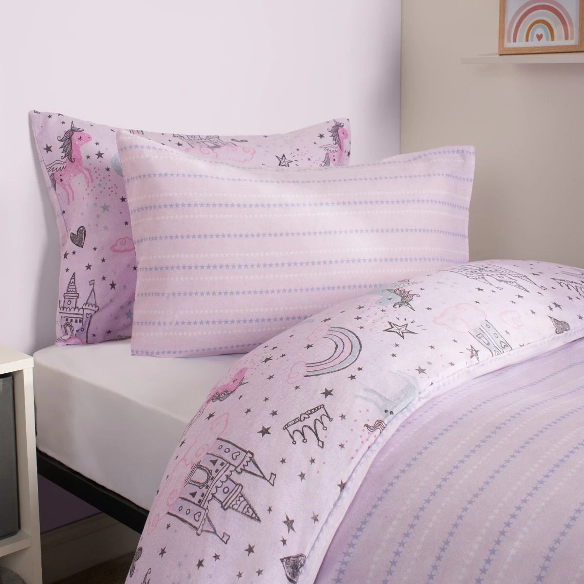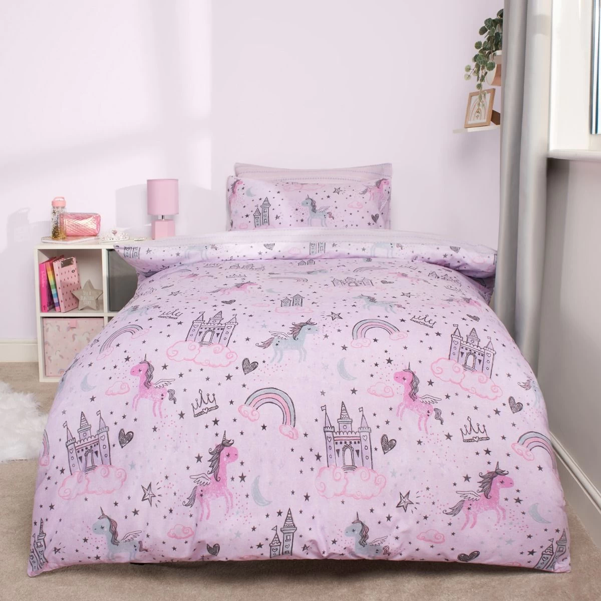 Create a magical haven for your child with the OHS Unicorn Kingdom Duvet Set in Lilac. The captivating design adorned with unicorns infuses a sense of wonder into their space. With a delicate lilac hue and imaginative theme, this duvet set fosters comfort and creativity. Make bedtime an enchanting adventure with this whimsical addition to your child’s room.