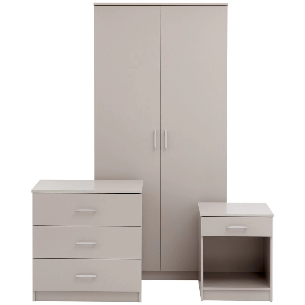 Comprises a 2 Door Wardrobe, 3 Drawer Chest and a Bedside Table