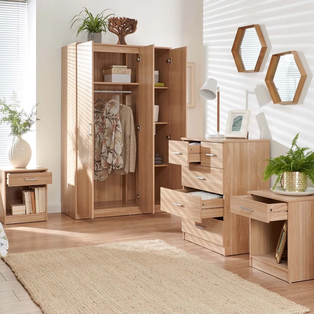 Comprises a 3 Door Wardrobe, 5 Drawer Chest and a Pair of Lamp Tables