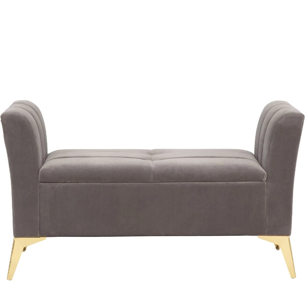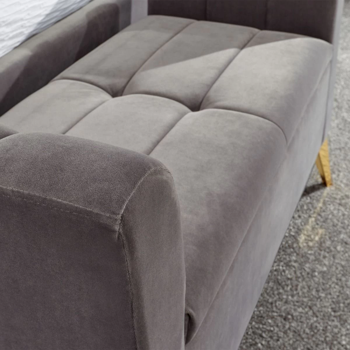 Give an underused window bay – or other bedroom nook – an eye-catching feature with this gloriously elegant window seat. The gently flared arms feature a classic sculpted design and flank a comfortable seat beneath which is concealed a useful lined storage compartment – perfect for blankets and throws. The deep padded frame and seat is upholstered in a tactile plush fabric with a matt velvet pile that looks and feels wonderfully indulgent. The angled gold-effect metal legs add a contemporary contrast to the seat’s classic lines. Pick from blush pink and soft grey colourways.