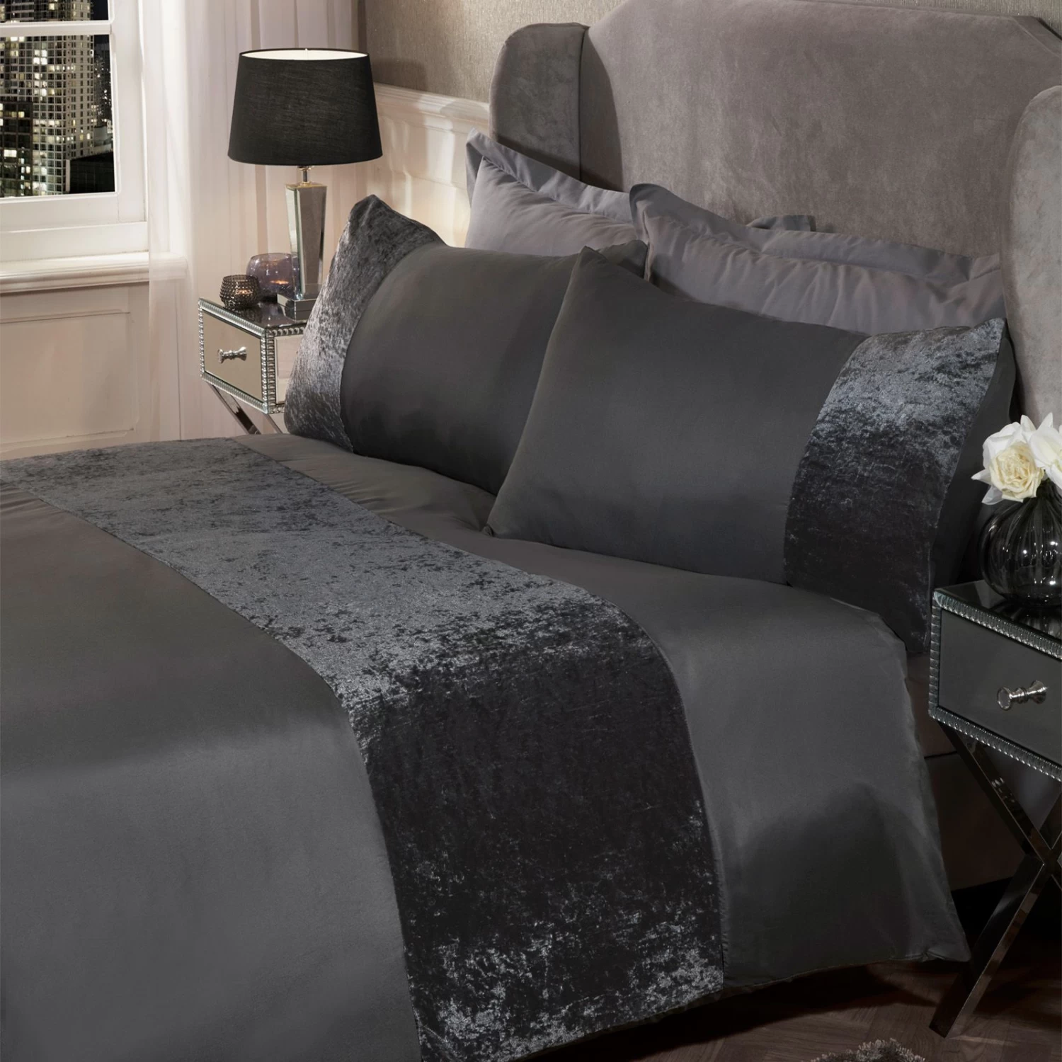 This luxurious crushed velvet panel duvet cover set from the Sienna Home Collection would look ideal in any bedroom due to its metallic crushed velvet band design and striking colours. This is a perfect way to give your room a fresh, modern look, with its subtle colours. This duvet set is made from soft touch polyester, making it soft, comfortable and durable. This easy-care bed linen will give your bedroom an instant sophisticated look and once washed it has great resistance to wrinkles, fading and shrinkage. It includes a duvet cover and matching pillow case(s), all you need for a good nights sleep. Available in the following sizes:-