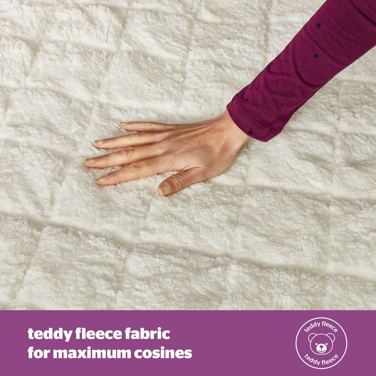 Introducing the Silentnight Teddy Fleece Electric Blanket, your cosy friend during the colder months. Equipped with 3 heat settings, this blanket allows you to choose a temperature that is just right for you in order to get the best night’s sleep possible. The Silentnight Teddy Fleece Electric Blanket is also an energy efficient and affordable way to stay warm for less. Pre-heating your bed for 1 hour on a low heat setting costs as from little as 1p, so you can afford to cosy up night after night. Finished with an easy fit strap, this cosy essential securely fits onto your mattress. This blanket comes with overheat protection, which means it will automatically shut down if a hot spot of fault is detected, guaranteeing you a great night’s sleep worry free. We recommend turning off the appliance before falling asleep to regulate your core temperature.