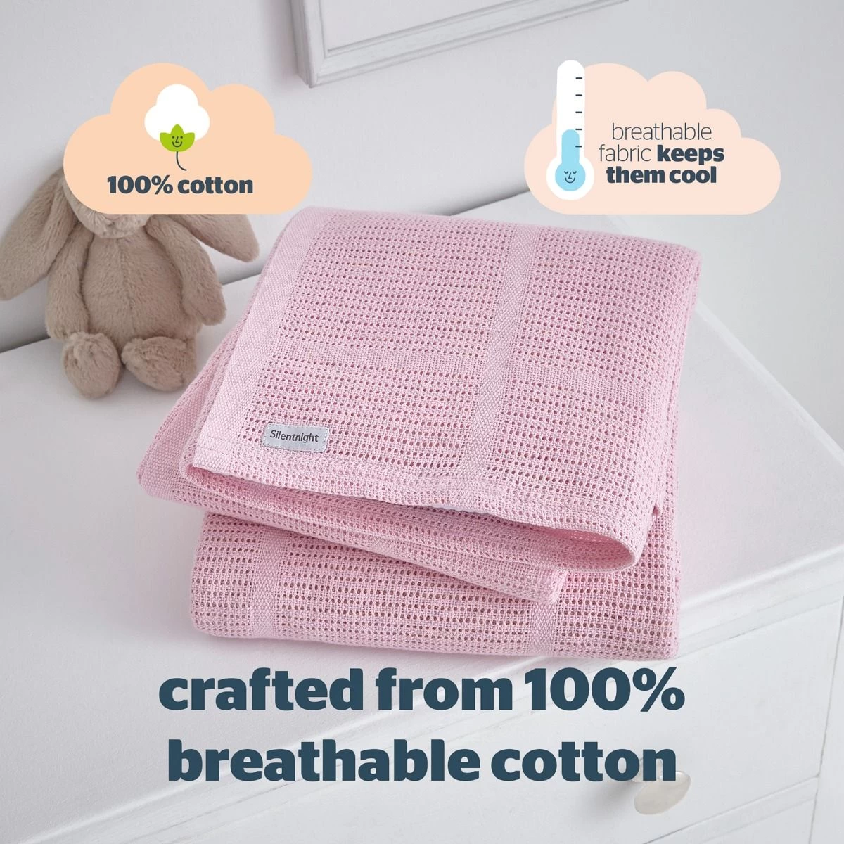 Crafted from super soft 100% cotton, this Safe Nights Blanket’s cellular construction combines insulation with breathability to keep baby warmer in winter and cooler in summer. The blanket is ideal to use in your little one’s pram or cot to keep your baby comfortable day and night.